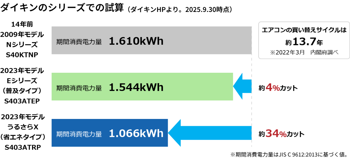 家庭の家電製品の電力消費量はエアコンだけで3割を超える※ため、省エネタイプのエアコンを選ぶことは電気代の節約につながります。一般的に、省エネ基準達成率やエネルギー消費効率(APF値)の数値が大きいエアコンほど省エネ性に優れています。また期間消費電力量(kWh)は、数値が小さいほどエネルギー効率が良いと言えます。