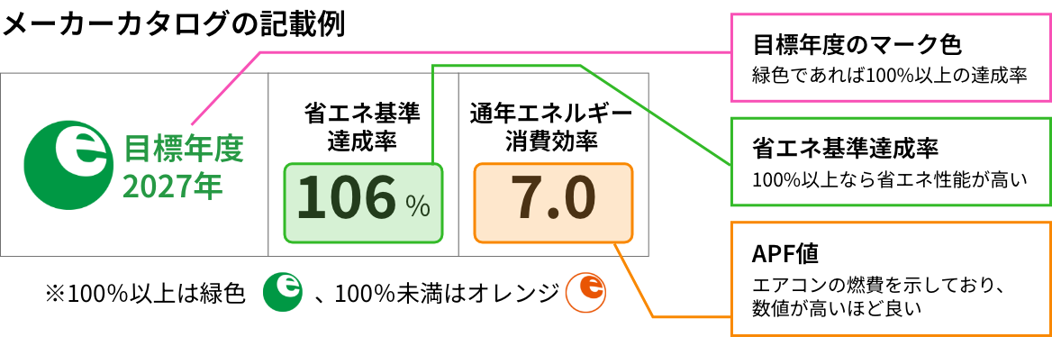 各メーカーカタログには省エネ性能を表す通年エネルギー消費効率(APF値)が記載されています。数値が高いほど省エネ性に優れていることを表します。この数値を設定された目標数値と比べたものが「省エネ基準達成率」になります。この達成率が大きいほど省エネ性能も高く、100%を超えていれば十分に高いと判断できます。