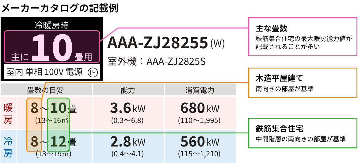 「主な畳数」鉄筋集合住宅の最大暖房能力値が記載されていることが多く、「〇畳用エアコン」という場合はこの畳数を指していることが多いです。